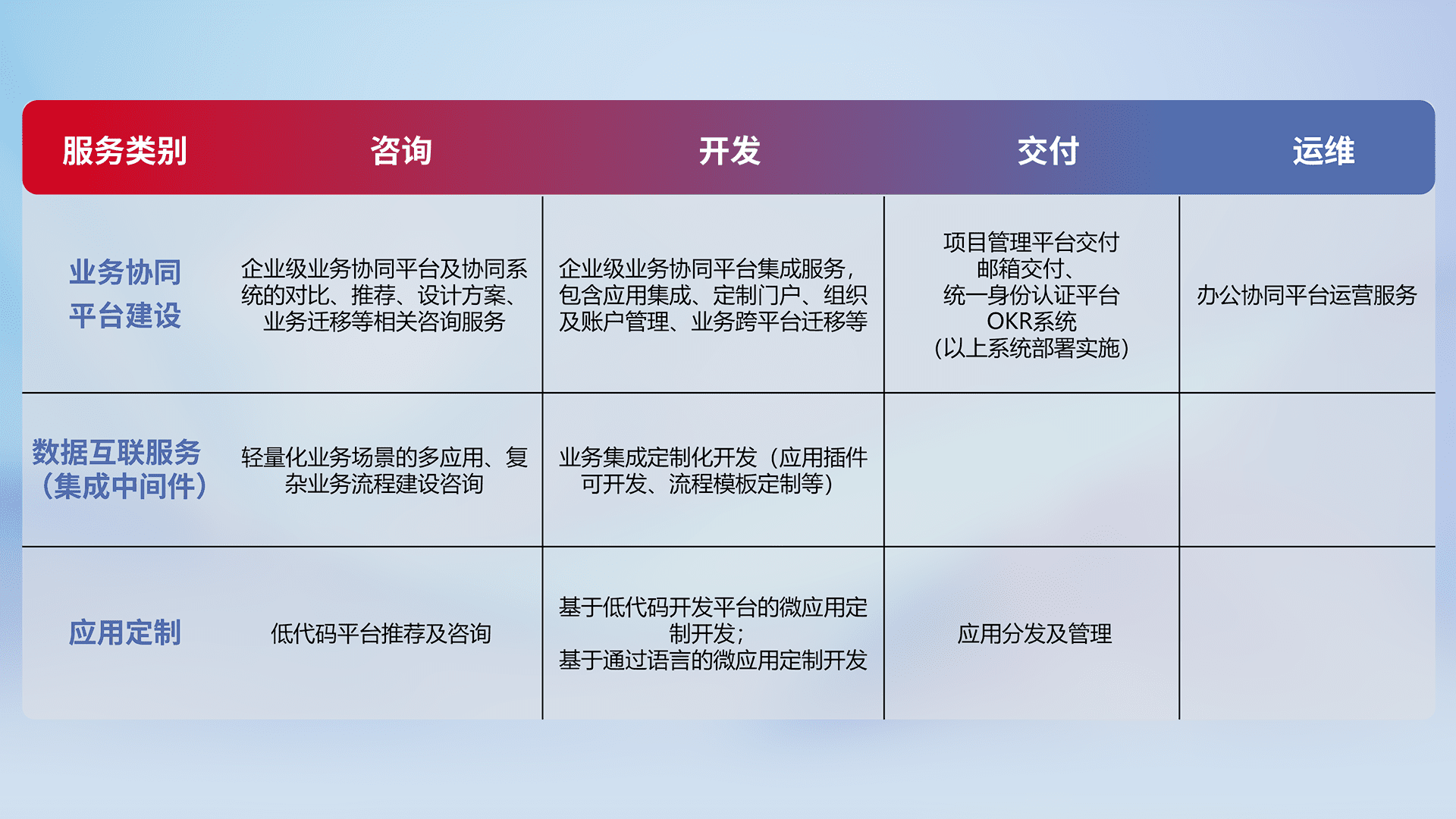 针对钉钉、、企微、、、、IDaas等平台级产品提供产品的规划、、、方案、、交付、、定制化开发等服务,,实现如统一协同办公、、智能客户服务、、混合会议管理、、智能数据查询、、等业务场景,,实现数字化转型。。