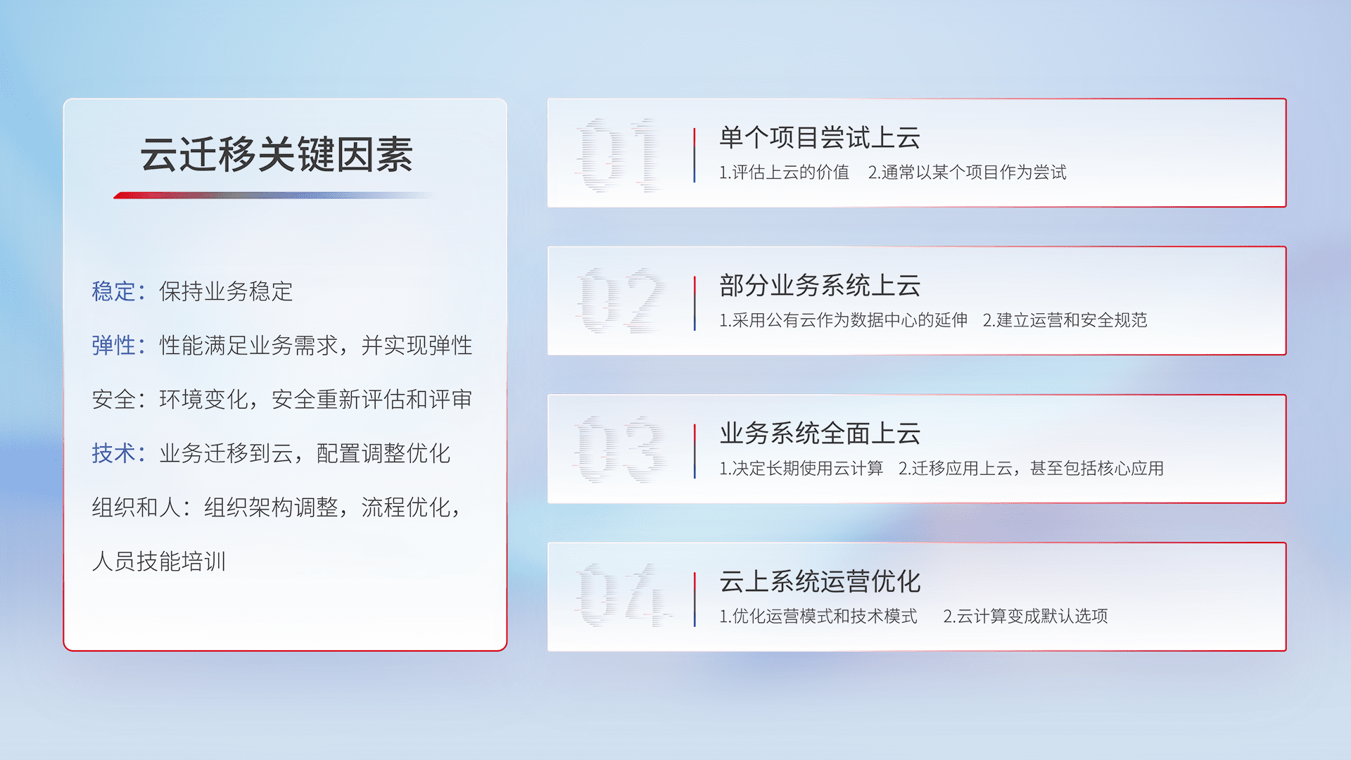 结合实际业务,,从规划设计、、、、云平台选型、、、云原生改造、、、数据迁移、、、集成交付,,,,迁移全过程为客户识别最佳上云路径,,,,做好风险识别管理,,,设计网络架构、、身份权限、、、安全审计合规、、、操作审计、、日志审计、、、监控告警策略、、、多站点容灾设计等,,,对云上基础设施进行整体规划,,提升IT治理水平,,,以满足弹性、、、、高可用、、高性能的需求。。。