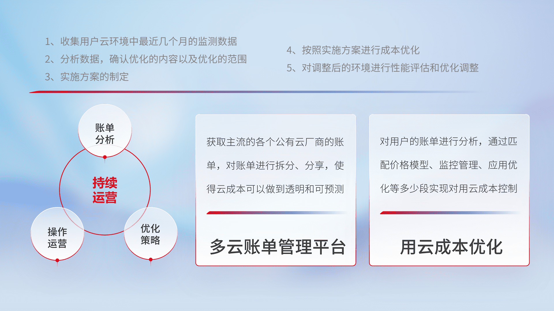 通过多云纳管,,,,以统一的资源数据模型把客户的云资源进行抽象和封装,,,进而实现对多云资源的统一操作,,,保障云资源管理的可靠性、、、、稳定性与可用性。。。。量身定制化运维内容,,,配置、、、、开发运维、、、、补丁管理、、、备份、、、、监控、、、认证和访问管理、、、、审计和日常巡检等,,,,保障在用云过程中的可靠度,,,稳定度以及高可用率。。。。