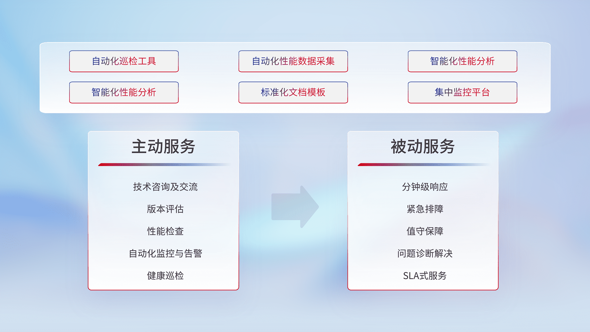 智能化工具和标准化文档,,,保障服务质量,,,,提供主动服务(包含技术咨询、、、版本评估、、、性能检查、、、、自动化监控与告警、、健康巡检)和被动服务包含(分钟级响应、、、、紧急排障、、、、值守保障、、、问题诊断解决、、、SLA服务)。。